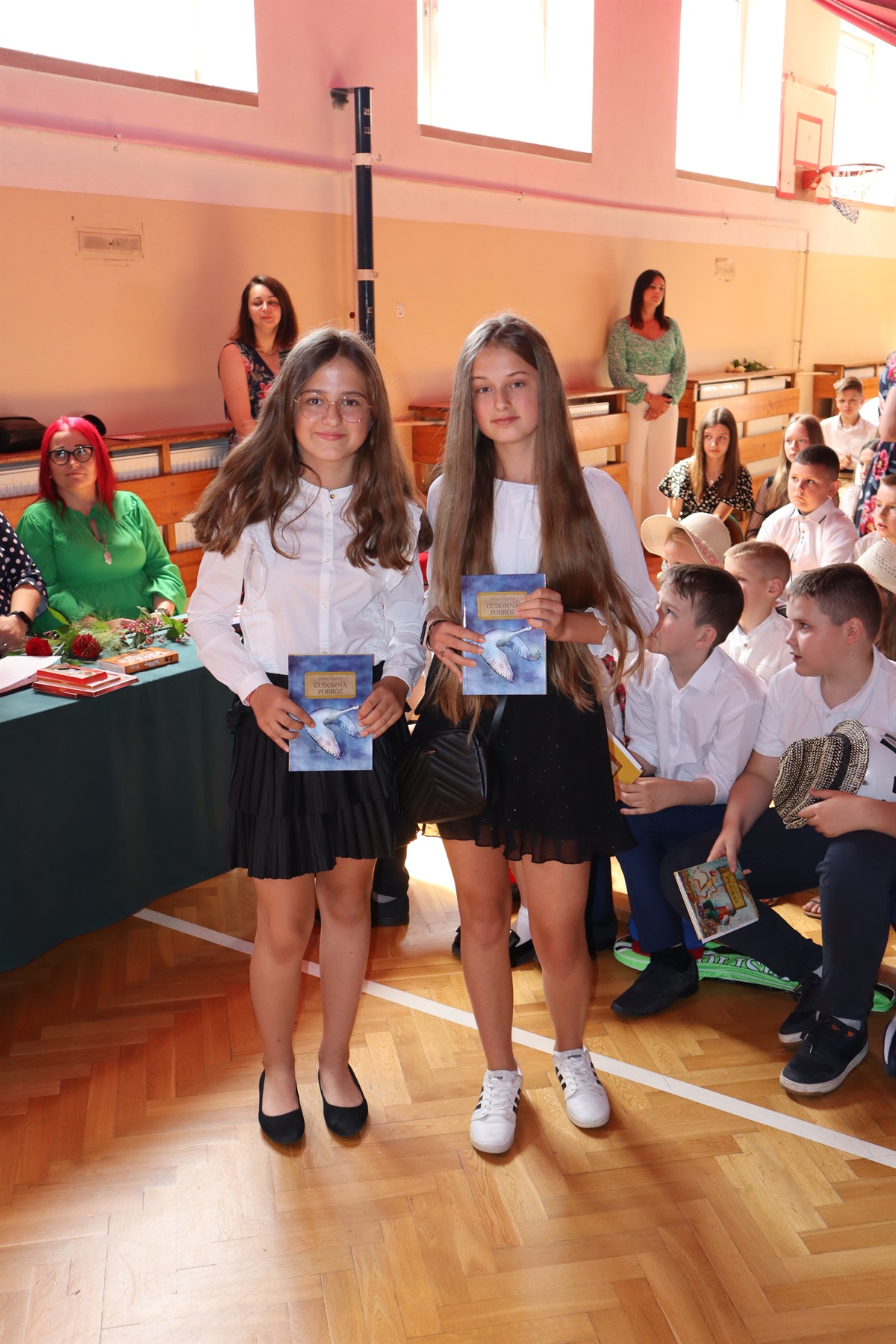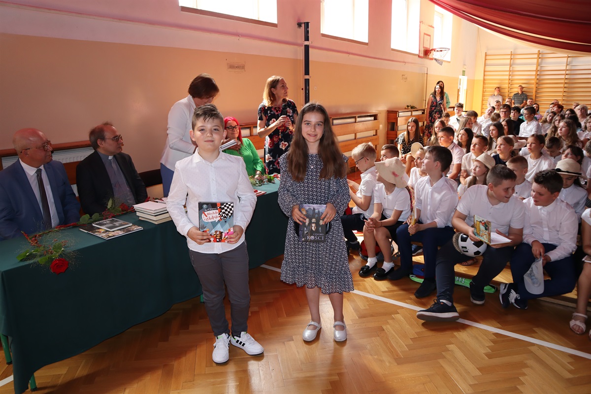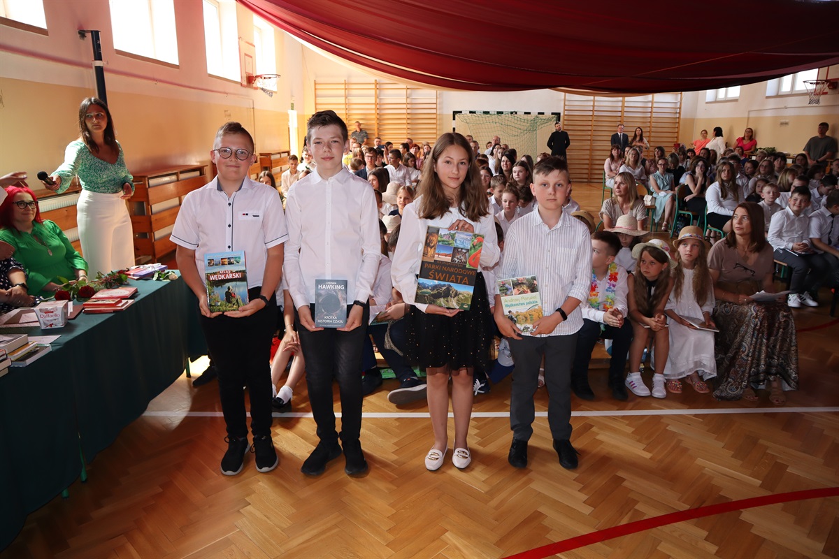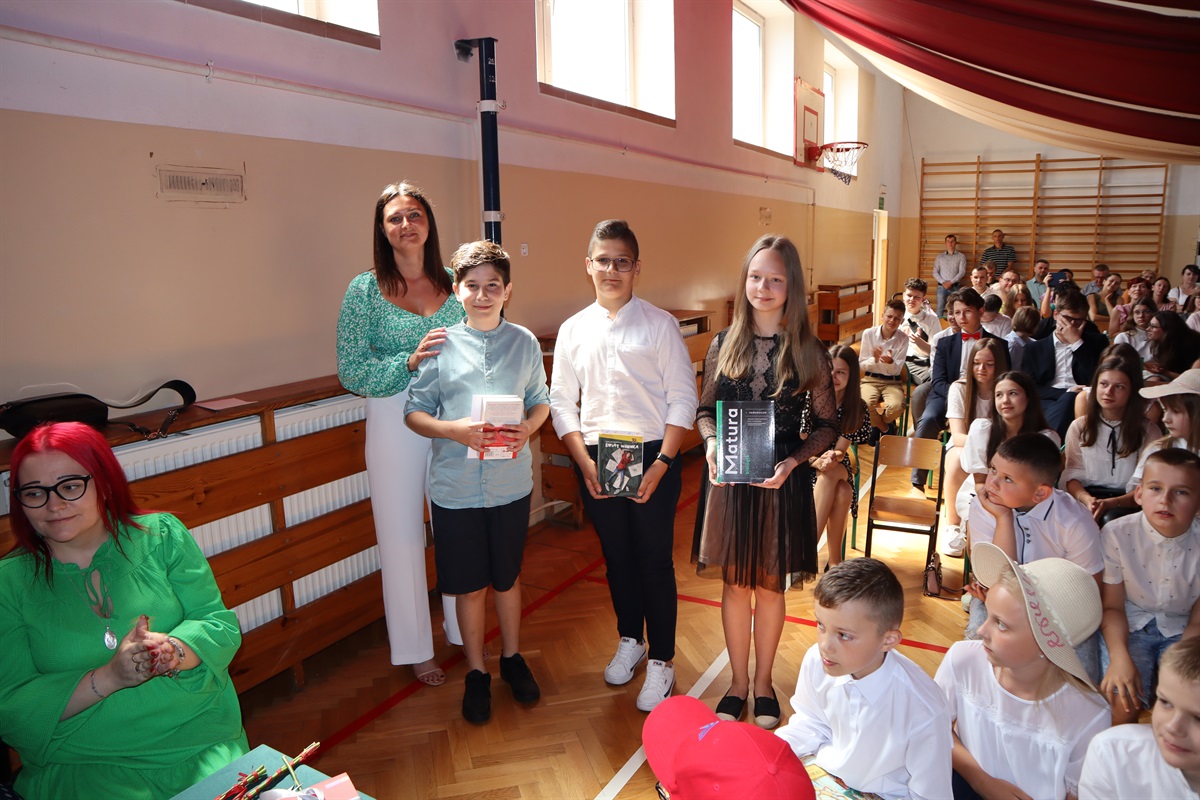 Najwięcej emocji i wzruszeń pojawiło się podczas ślubowania i nagradzania absolwentów szkoły. Nagrody za osiągnięcia w nauce otrzymali następujący ósmoklasiści: Zosia Dalewska, Weronika Dróżdż, Iza Glinka oraz Karolina Ryś. Izabela Glinka otrzymała nagrodę za liczne sukcesy w konkursach pozaszkolnych, a Bartosz Trojan- za aktywność i niezawodność w działaniu Samorządu Uczniowskiego.
