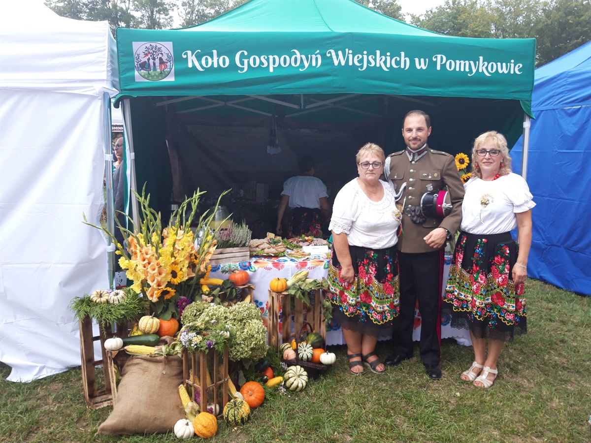 Gminę Moszczenica na dożynkach powiatowych, które odbyły się w niedzielę, 28 sierpnia reprezentowały panie z KGW Pomyków. Na stoisku nie zabrakło swojskiego jadła zrobionego przez panie tegoż koła. Królował czerwony barszczyk z pierogami, pasztecikami i krokietami. Był również smalczyk z ogórkiem, ciasta, rogaliki, babeczki, wyroby wędliniarskie, pieczone mięsa i chlebek z ziarnami. Przy stoisku przygrywała kapela „Tolka Gałązki”.