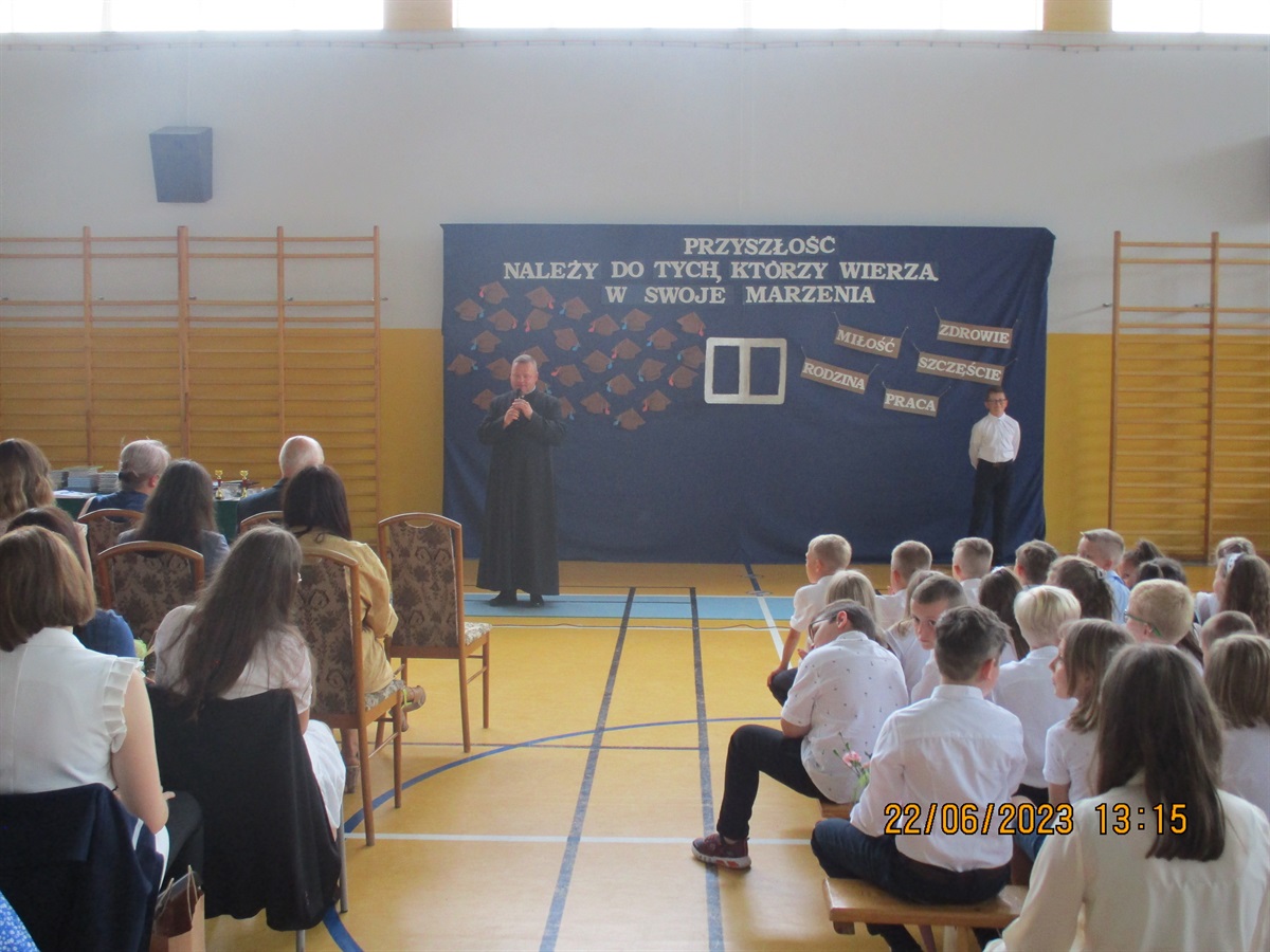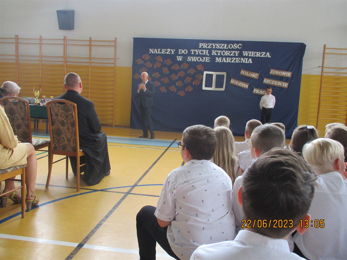 Dyrektor szkoły Bożena Nowak – Justyna, podziękowała wszystkim za mijający rok. Skierowała słowa uznania do pedagogów i pracowników szkoły, uczniów, rodziców i władz gminy, wyrażając wdzięczność za kreatywność, a także pełne zaangażowania oraz profesjonalne podejście do wyzwań szkolnej rzeczywistości. - To piękne móc uczestniczyć w uczniowskim dojrzewaniu, móc dostrzegać sukcesy swoich wychowanków, żyć ich wyzwaniami, niepewnością, nadziejami, widzieć w ich oczach łzy wzruszenia, szeroki promienny uśmiech będący zwieńczeniem ciężkiej pracy. W chwilach zmęczenia czerpać z młodzieńczego zapału i entuzjazmu, być obdarzanym zaufaniem i szacunkiem. To te właśnie cechy budują nierozerwalne więzi w każdym ludzkim zespole, są podstawą pokonywania barier i murów - te szczególne słowa skierowała do absolwentów szkoły.