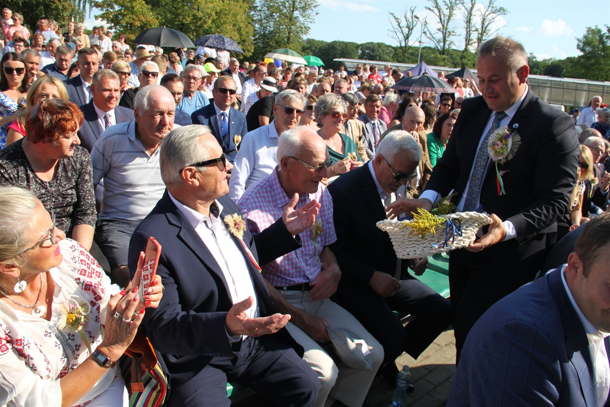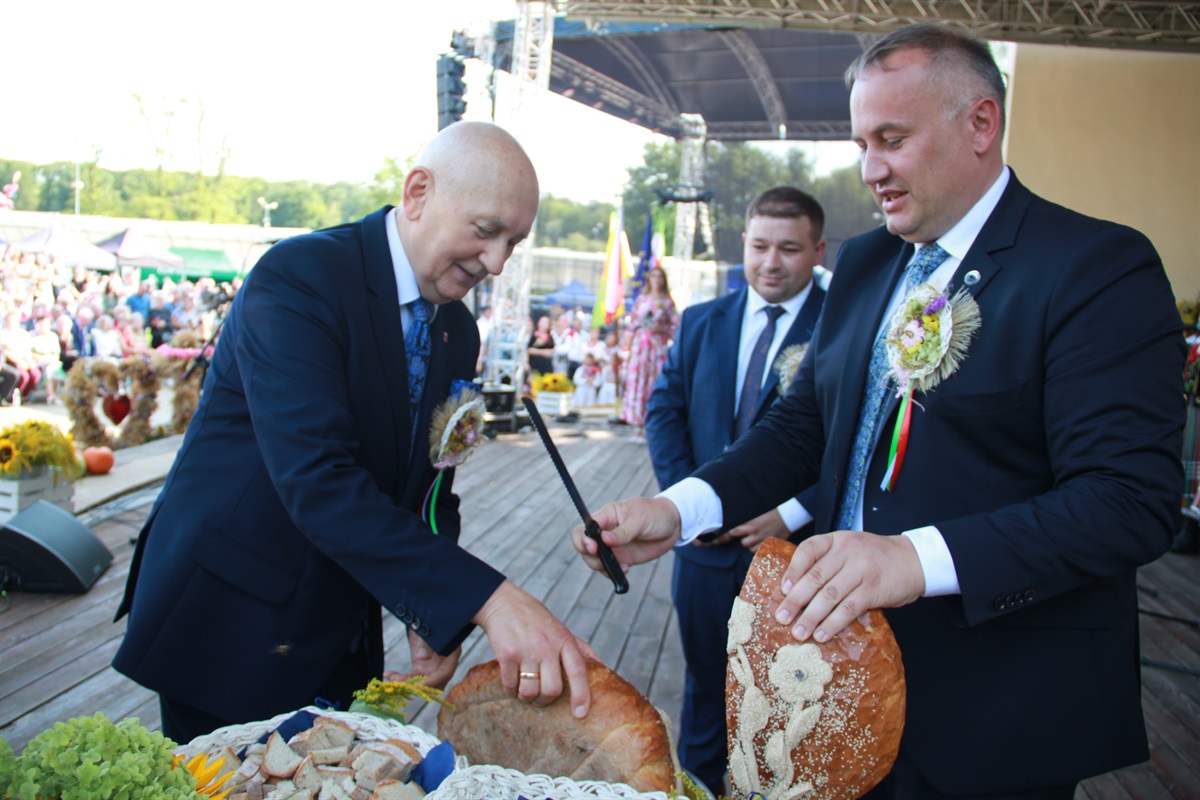 Po pobłogosławieniu darów ziemi barwny korowód udał się do amfiteatru gminnego, gdzie odbył się tradycyjny ceremoniał dożynkowy. Starostowie dożynek - Dominika Misztela z Kamocinka i Kamil Mirowski z Rękoraja przekazali na ręce Piotra Wojtysiaka, starosty piotrkowskiego i wójta Marcelego Piekarka chleb z tegorocznej mąki. Tradycyjnie bochen pokrojono o częstowano nim gości.
