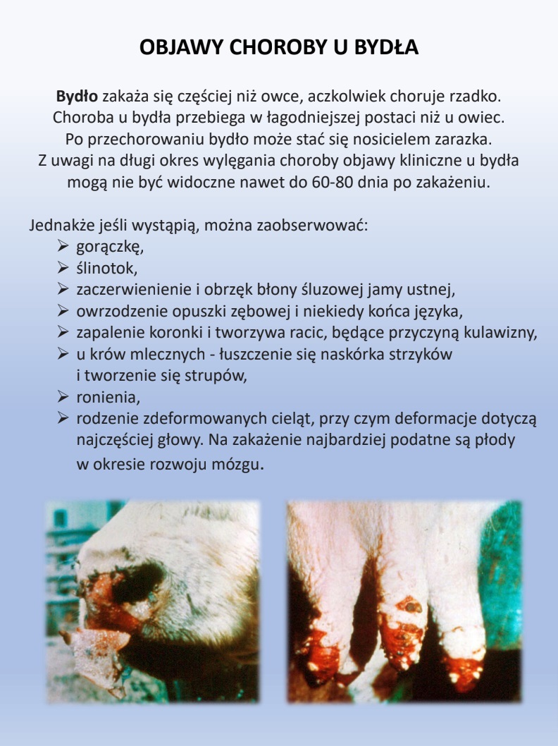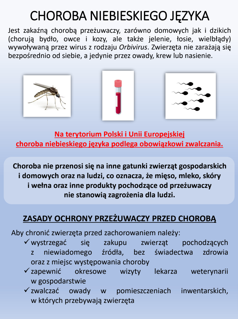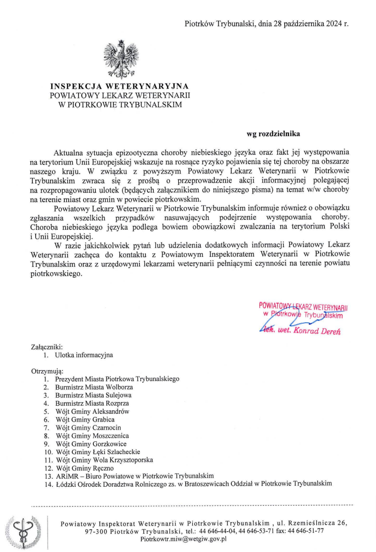 "Aktualna sytuacja epizootyczna choroby niebieskiego języka oraz fakt jej występowania na terytorium Unii Europejskiej wskazuje na rosnące ryzyko pojawienia się tej choroby na obszarze naszego kraju. W związku z powyższym Powiatowy Lekarz Weterynarii w Piotrkowie Trybunalskim zwraca się z prośbą o przeprowadzenie akcji informacyjnej polegającej na rozpropagowaniu ulotek (będących załącznikiem do niniejszego pisma) na temat w/w choroby na terenie miast oraz gmin w powiecie piotrkowskim.