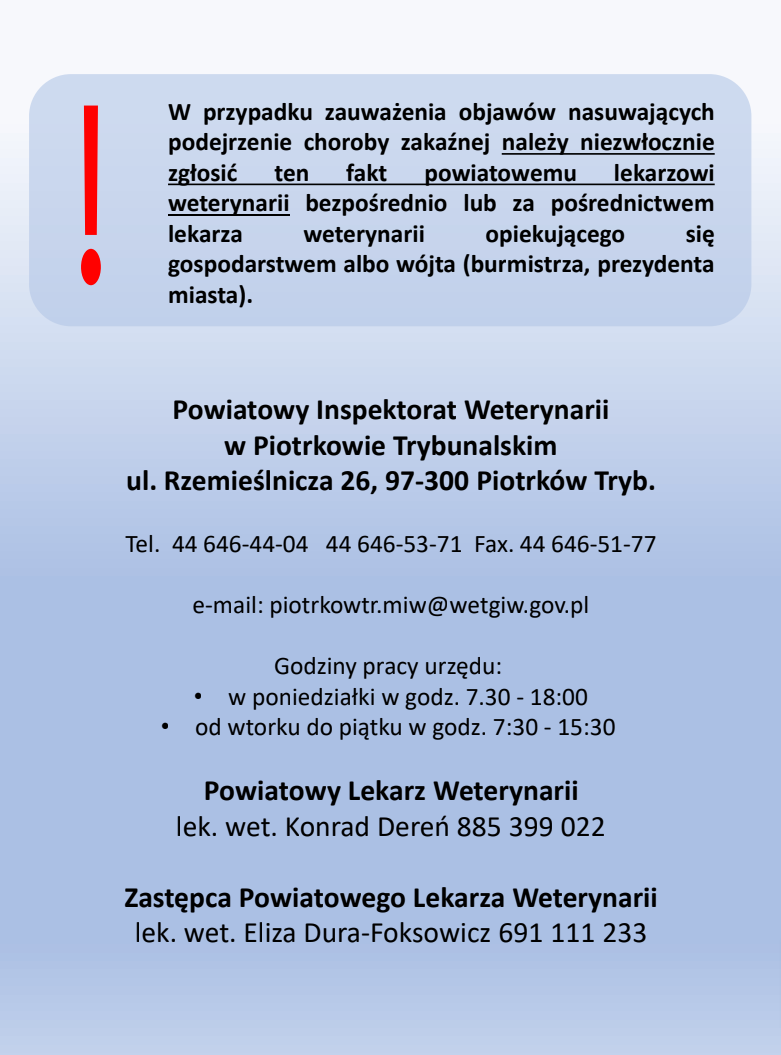 W razie jakichkolwiek pytań lub udzielenia dodatkowych informacji Powiatowy Lekarz Weterynarii zachęca do kontaktu z Powiatowym Inspektoratem Weterynarii w Piotrkowie Trybunalskim oraz z urzędowymi lekarzami weterynarii pełniącymi czynności na terenie powiatu piotrkowskiego."