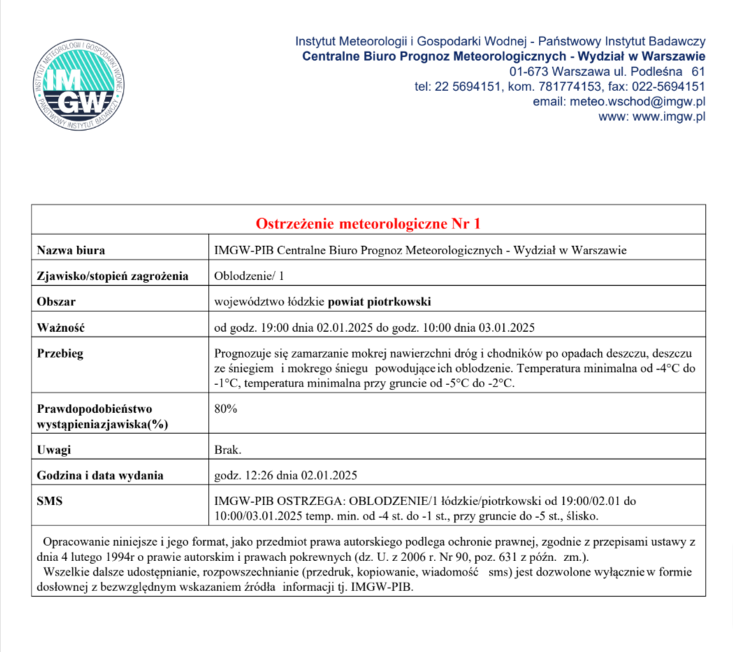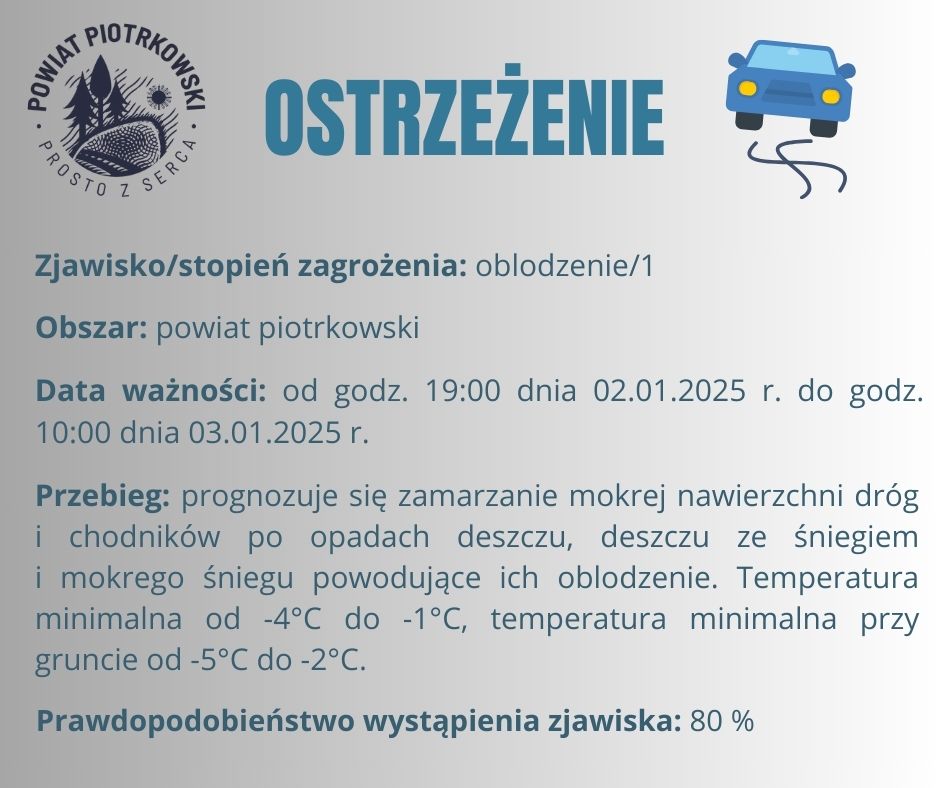 dzisiaj tj. 02.01 Instytut Meteorologii i Gospodarki Wodnej wydał ostrzeżenie dla całego powiatu piotrkowskiego, które związane jest z oblodzeniem. Dzisiejsza mroźna i wietrzna pogoda sprzyja powstaniu oblodzeniom, których prawdopodobieństwo powstania wynosi aż 80%!