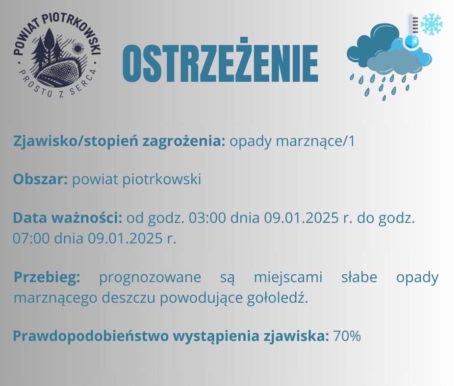 dzisiaj tj. 08.01 Instytut Meteorologii i Gospodarki Wodnej wydał ostrzeżenie dla całego powiatu piotrkowskiego, które związane jest z gołoledzią na jezdniach. Dzisiaj w nocy prognozowane są miejscami słabe opady marznącego deszczu powodujące gołoledź.