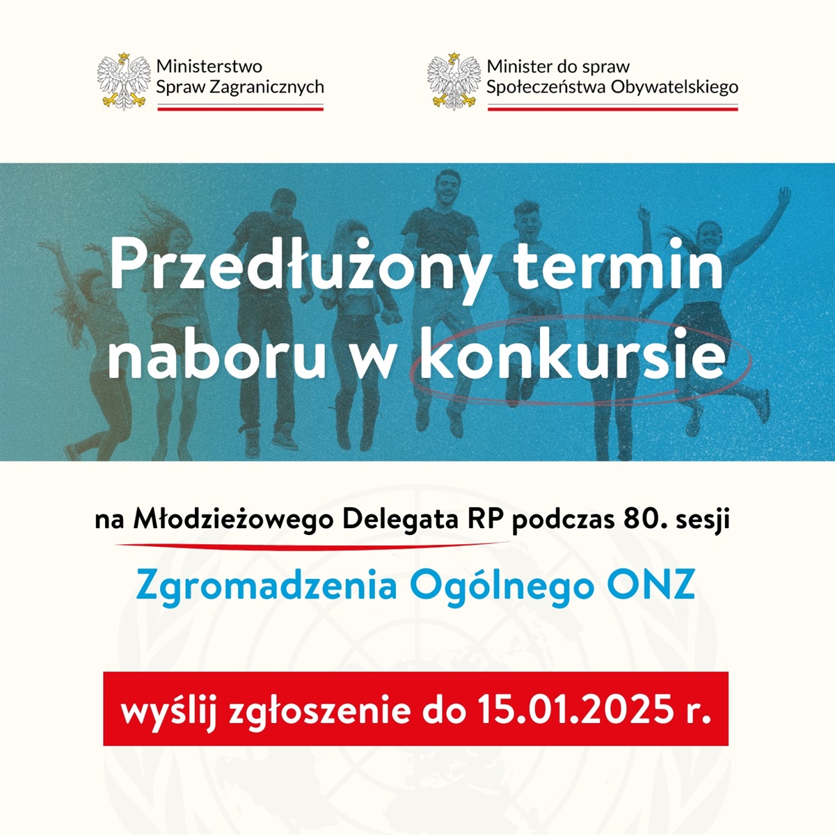 Szanowni Państwo, informujemy, że termin przyjmowania zgłoszeń w konkursie na Młodzieżowego Delegata RP na 80. sesję Zgromadzenia Ogólnego ONZ został wydłużony do 15 stycznia 2025 r.