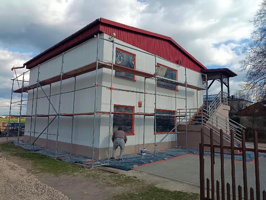 W ramach II etapu remontu elewacji Domu Ludowego w Karlinie: położono siatki, kleje i tynk na całej elewacji. Zabezpieczono okna i drzwi na czas wykonywania prac. Wykonano obróbkę okiena (14 sz.) i drzwi (4 szt.) a także wymieniono parapety zewnętrzne.