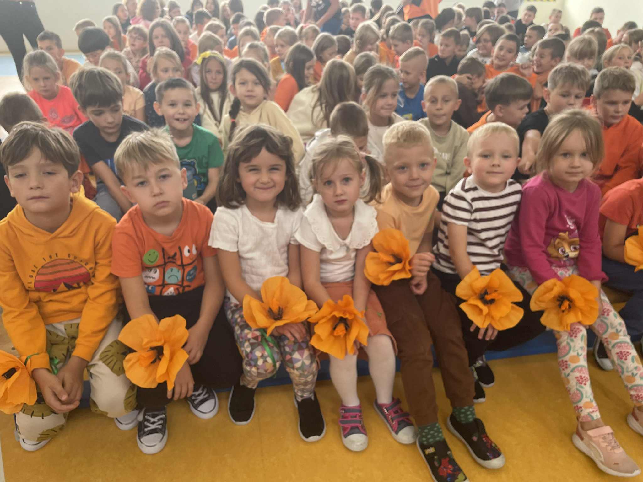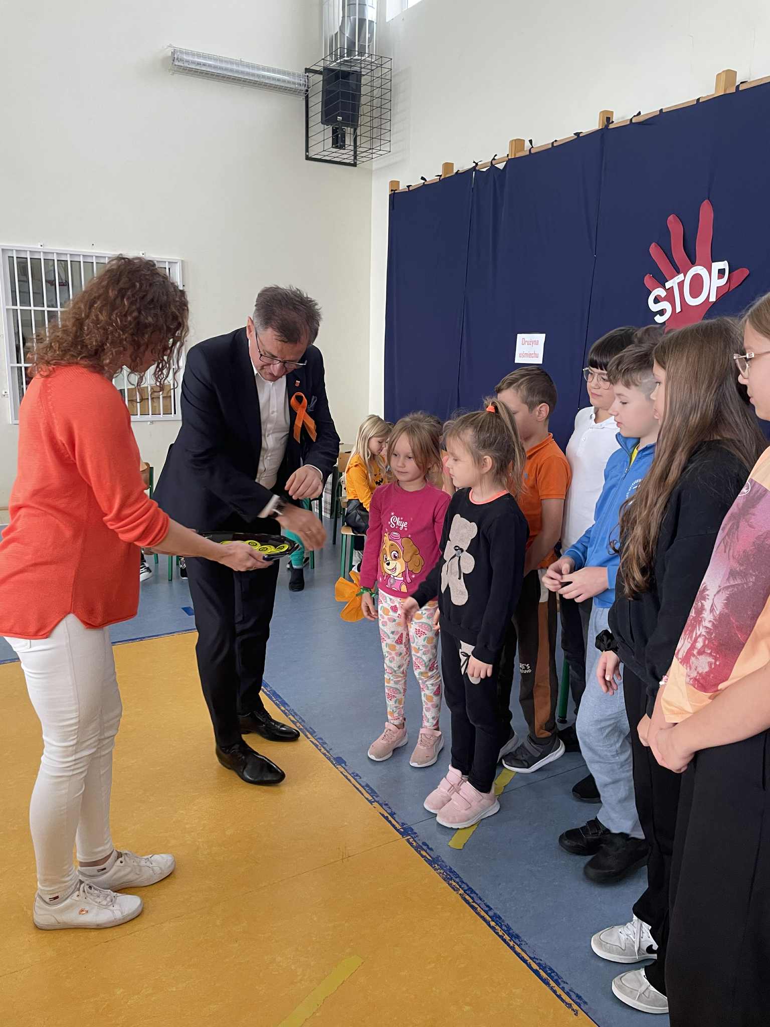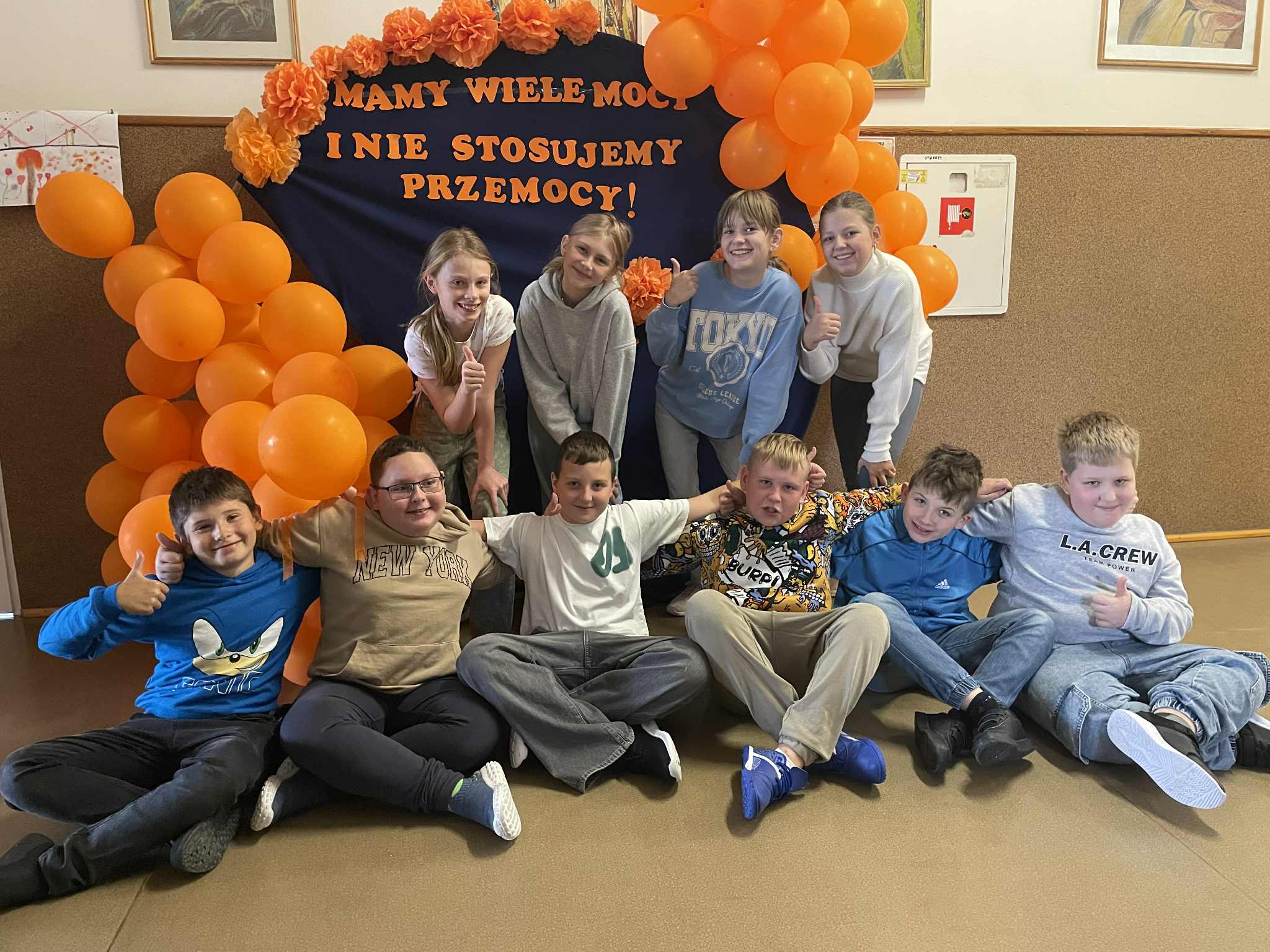 • Ścianka w kolorze pomarańczowym, przy której uczniowie mogli robić wspólne zdjęcia, utrwalając miłe chwile i budując pozytywne wspomnienia.