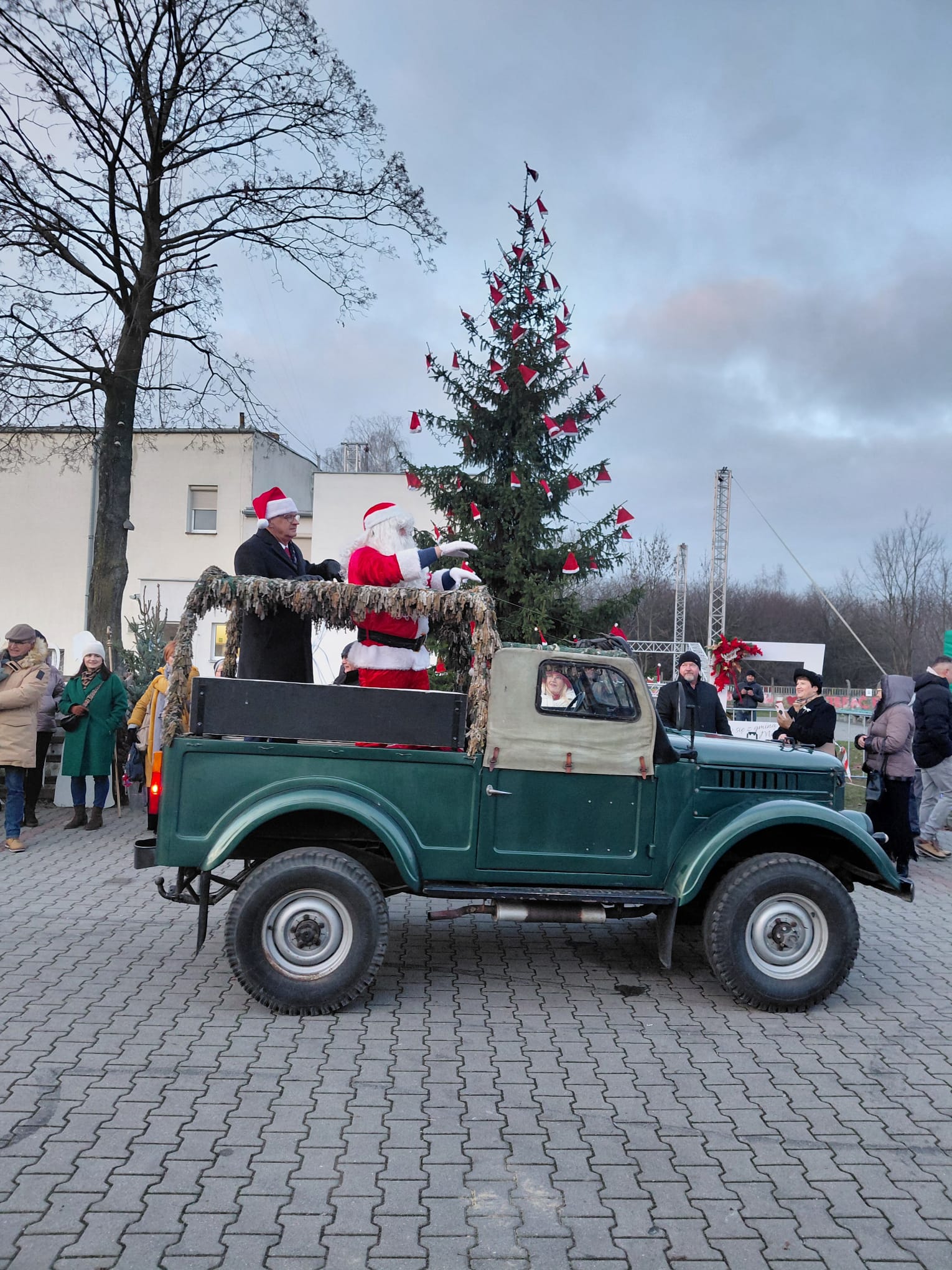 O godzinie 15:00 jarmark rozpoczął się koncertem kapeli Tkacze, który wprowadził uczestników w świąteczny nastrój. Tuż po nim na plac wjechały zabytkowe samochody, w których przybył wyczekiwany przez dzieci święty Mikołaj. Towarzyszyli mu: wicemarszałek województwa łódzkiego Piotr Wojtysiak, wójt Gminy Moszczenica Dariusz Magacz oraz Przewodnicząca Rady Gminy Moszczenica Iwona Jarosińska. Po złożeniu świątecznych życzeń wójt wspólnie ze św. Mikołajem zapalili światełka na gminnej choince, symbolicznie inaugurując jarmark „na całego”.