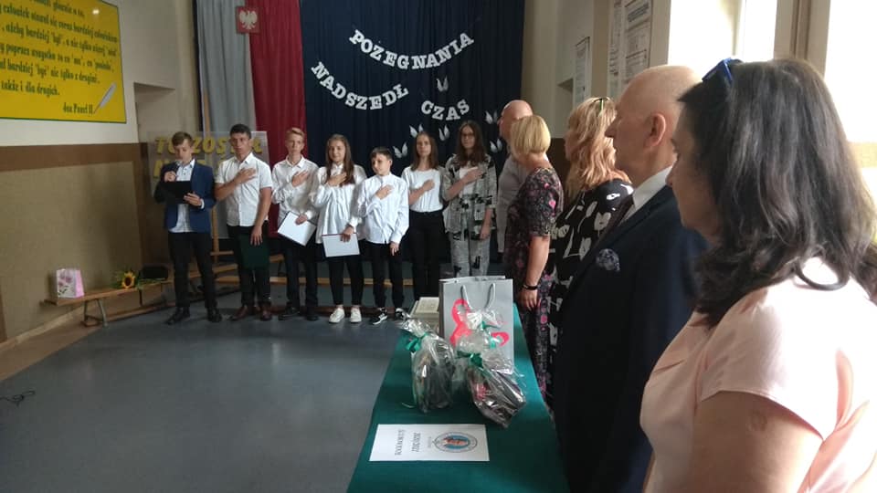 Zakończenie roku szkolnego miało uroczysty charakter, jednak ze względu na obecną sytuację odbywało się hybrydowo. Klasy I-VI spotkały się z wychowawcami w klasach, a uczniowie z klasy VII pożegnali swoich kolegów opuszczających mury tej szkoły. Ósmoklasiści dali popis wokalny, podziękowali nauczycielom, rodzicom, dyrektorowi, obsłudze, złożyli uroczyste ślubowanie i zostali obdarowali przez klasę VII tortem. Liczne nagrody i świadectwa z czerwonym paskiem świadczą o wielkości tej "siódemki wspaniałych"!
